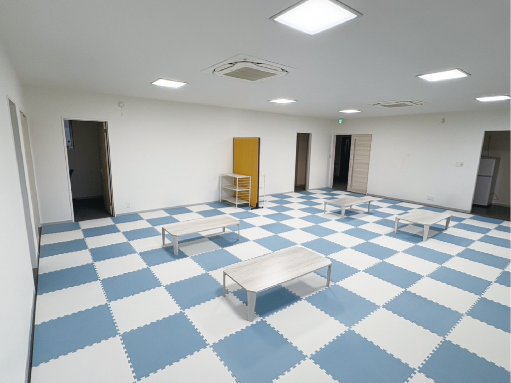 お子様が普段過ごされる支援スペースには芝生風のマットを用いて、落ち着く空間を作っています。